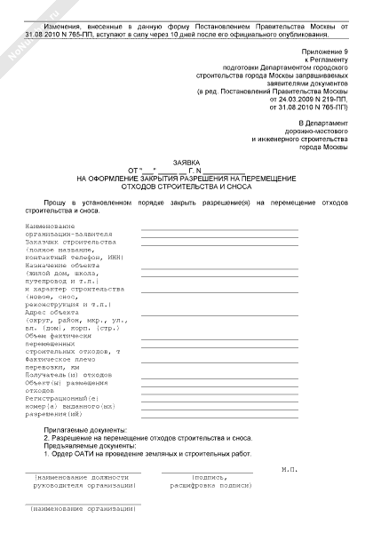 - 41Заявка в Департамент дорожно-мостового и инженерного строительства города Москвы на оформление закрытия разрешения на перемещение отходов строительства и сноса по городу
