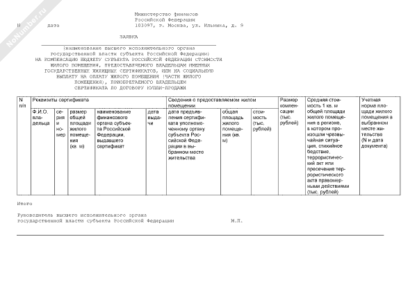 - 47Заявка высшего исполнительного органа государственной власти субъекта Российской Федерации на компенсацию бюджету субъекта Российской Федерации стоимости жилого помещения, предоставляемого владельцам именных государственных жилищных сертификатов, или на социальную выплату на оплату жилого помещения (части жилого помещения), приобретаемого владельцем сертификата по договору купли-продажи