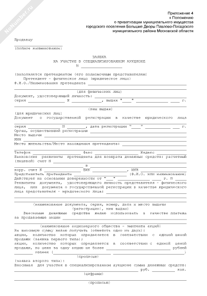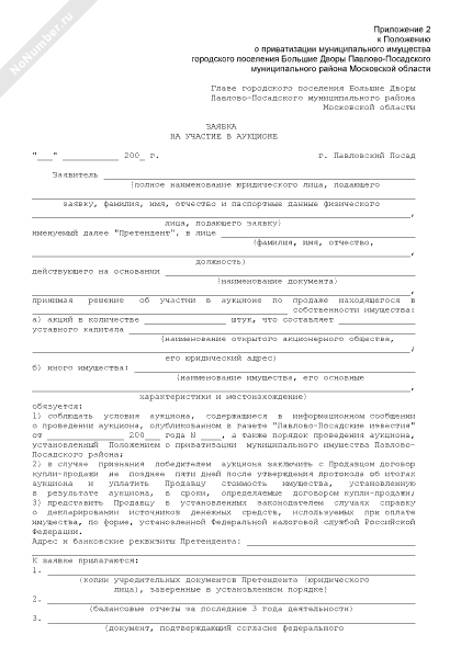 - 666Заявка на участие в аукционе по продаже муниципального имущества городского поселения Большие Дворы Павлово-Посадского муниципального района Московской области