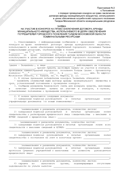 - 670Заявка на участие в конкурсе на право заключения договора аренды муниципального имущества, используемого в целях обеспечения потребителей городского поселения Талдом Московской области коммунальными ресурсами