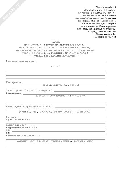 - 676Заявка на участие в конкурсе на проведение научно-исследовательских и опытно-конструкторских работ, выполняемых по заказам Минэкономики России, в том числе работ, входящих в закрепленные за министерством федеральные целевые программы