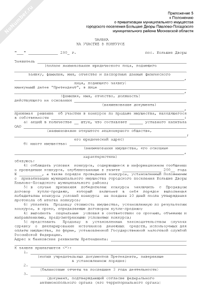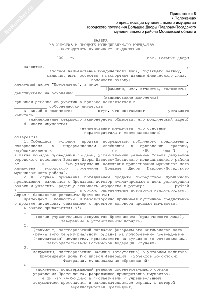- 675Заявка на участие в конкурсе по приватизации муниципального имущества городского поселения Большие Дворы Павлово-Посадского муниципального района Московской области