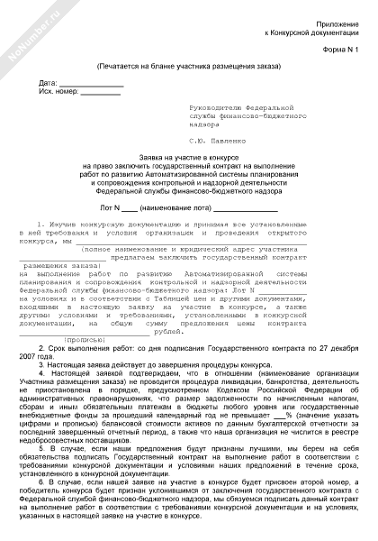 - 662Заявка на участие в конкурсе (приложение к конкурсной документации на право заключения государственного контракта на выполнение работ по развитию Автоматизированной системы планирования и сопровождения контрольной и надзорной деятельности Федеральной службы финансово-бюджетного надзора) (форма № 1)