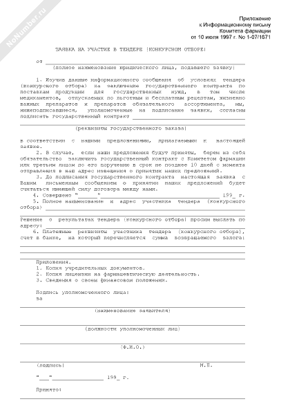 - 671Заявка на участие в тендере (конкурсном отборе) предприятий, организаций и учреждений на заключение государственного контракта на поставку лекарственных средств и изделий медицинского назначения