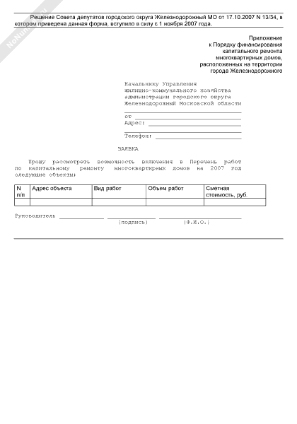 - 850Заявка на финансирование капитального ремонта многоквартирных домов на территории города Железнодорожного Московской области