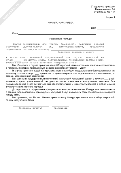 Конкурсная заявка поставщиков — участников торгов (конкурса) на поставку товаров и услуг (форма № 1)