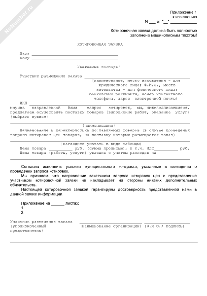 Котировочная заявка (приложение к извещению о проведении запроса котировок на право заключения муниципального контракта в г. Протвино Московской области)