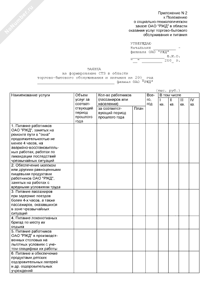Плановая заявка филиала ОАО «РЖД» на формирование социально-технологического заказа (СТЗ) в области торгово-бытового обслуживания и питания на год