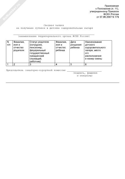 Сводная заявка на получение путевок в детские оздоровительные лагеря, создаваемые на базе федеральных государственных санаторно-курортных учреждений Федеральной службы Российской Федерации по контролю за оборотом наркотиков (рекомендуемый образец заполнения)
