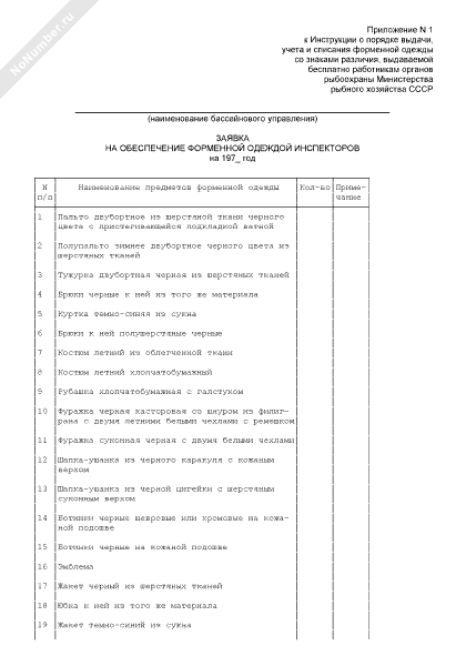 Заявка на обеспечение форменной одеждой госинспекторов Минрыбхоза СССР (рекомендуемый образец заполнения)