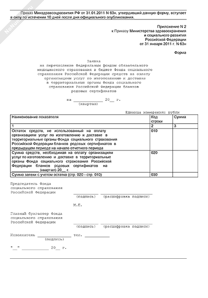Заявка на перечисление Федеральным фондом обязательного медицинского страхования в бюджет Фонда социального страхования Российской Федерации средств на оплату организациям услуг по изготовлению и доставке в территориальные органы Фонда социального страхования Российской Федерации бланков родовых сертификатов (рекомендуемый образец заполнения)