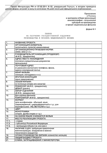 Заявка на получение государственной поддержки производства и проката национального фильма (форма № 1)