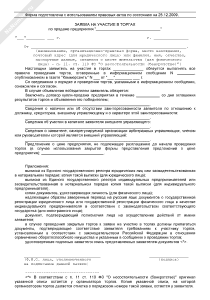 Заявка на участие в торгах по продаже предприятия должника
