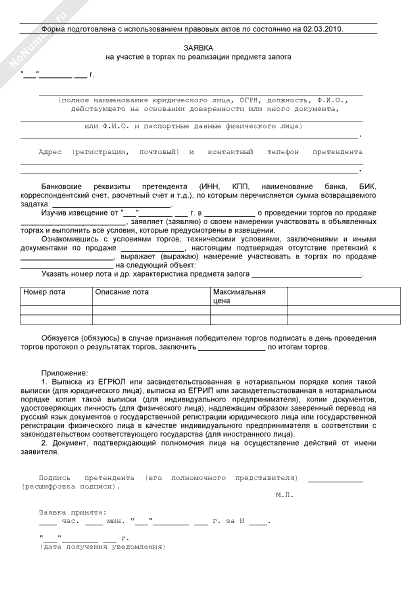 Заявка на участие в торгах по реализации предмета залога