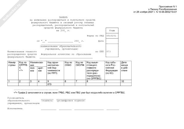 Заявка на включение распорядителя и получателя средств федерального бюджета в сводный реестр главных распорядителей, распорядителей и получателей средств федерального бюджета (Федеральное агентство по образованию)