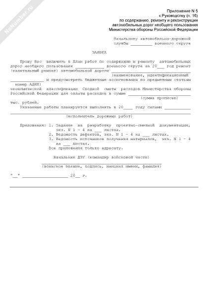 Заявка на включение в план работ по содержанию и ремонту автомобильных дорог необщего пользования военного округа работ по ремонту (капитальному ремонту) автомобильной дороги