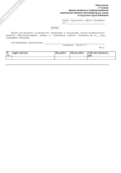 Заявка на включение в титульный список капитального ремонта многоквартирных домов в городском округе Балашиха Московской области (рекомендуемый образец заполнения)