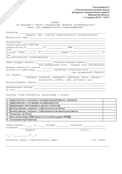 Заявка на внесение в реестр стационарных объектов потребительского рынка Шатурского муниципального района Московской области (для индивидуального предпринимателя)