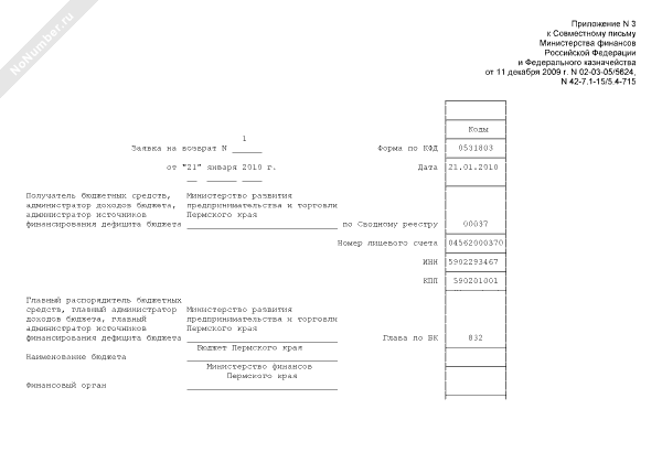 Заявка на возврат остатков целевых средств в федеральный бюджет (рекомендуемый образец заполнения)