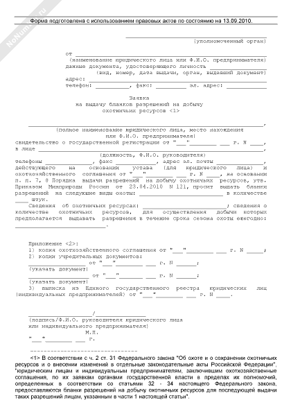 Заявка на выдачу бланков разрешений на добычу охотничьих ресурсов (рекомендуемый образец заполнения)