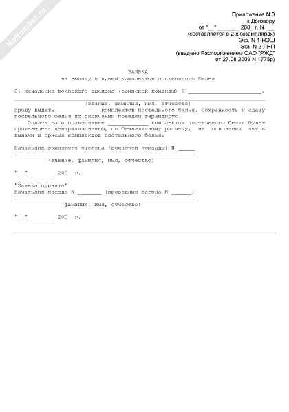 Заявка на выдачу и прием комплектов постельного белья