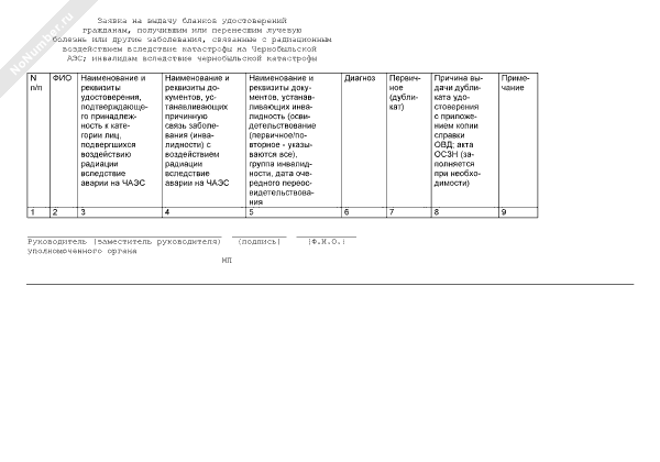 Заявка на выдачу бланков удостоверений гражданам, получившим или перенесшим лучевую болезнь или другие заболевания, связанные с радиационным воздействием вследствие катастрофы на Чернобыльской АЭС; инвалидам вследствие чернобыльской катастрофы (рекомендуемый образец заполнения)