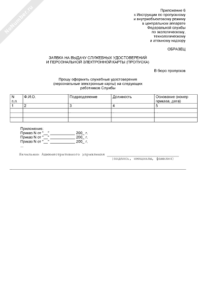 Заявка на выдачу служебных удостоверений и персональной электронной карты (пропуска) в здание центрального аппарата Федеральной службы по экологическому, технологическому и атомному надзору (рекомендуемый образец заполнения)