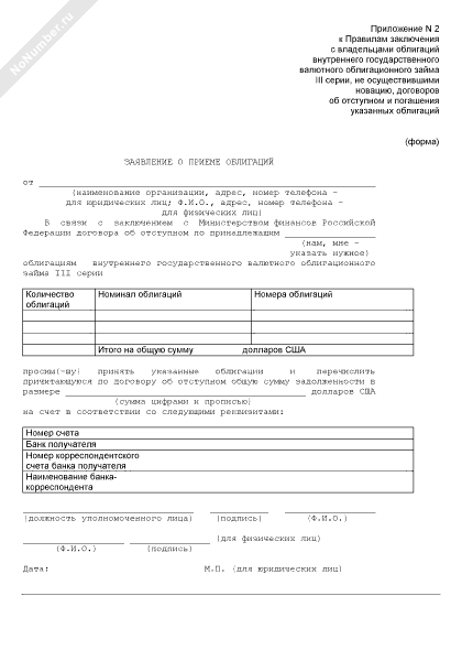 - 2069Заявление о приеме облигаций внутреннего государственного валютного облигационного займа III серии