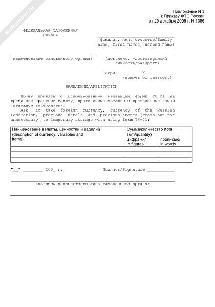 - 2066Заявление о принятии на временное хранение валюты, драгоценных металлов и драгоценных камней с использованием квитанции (рус./англ.)