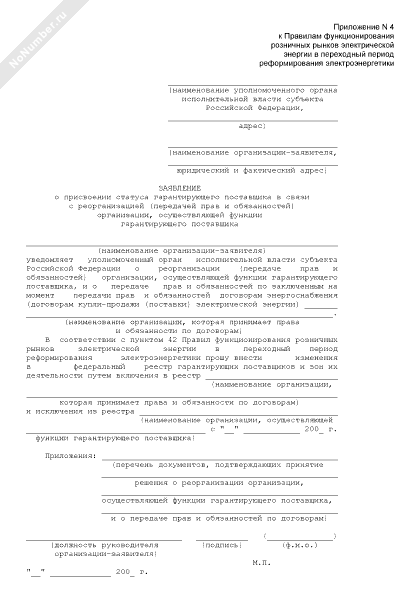 - 2062Заявление о присвоении статуса гарантирующего поставщика электрической энергии (мощности) в связи с реорганизацией (передачей прав и обязанностей) организации, осуществляющей функции гарантирующего поставщика