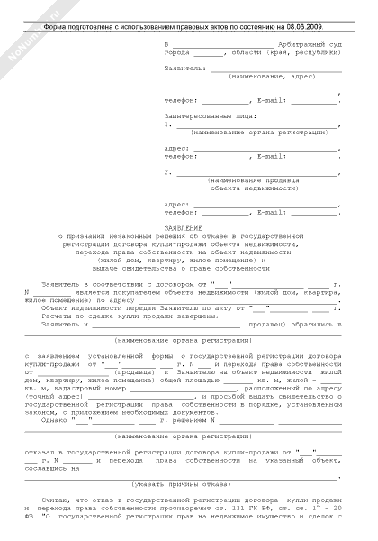 - 2079Заявление о признании незаконным решения об отказе в государственной регистрации договора купли-продажи объекта недвижимости, перехода права собственности на объект недвижимости (жилой дом, квартиру, жилое помещение) и выдаче свидетельства о праве собственности