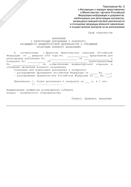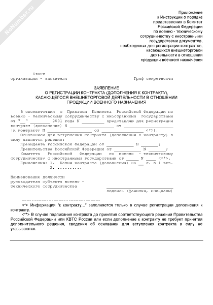 - 2223Заявление о регистрации дополнения к контракту, касающемуся внешнеторговой деятельности в отношении продукции военного назначения