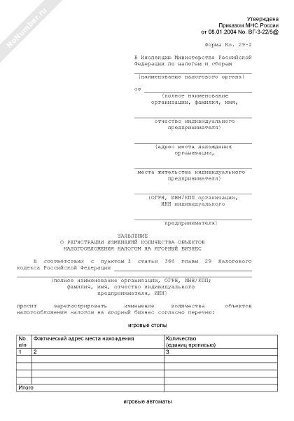 - 2231Заявление о регистрации изменений количества объектов налогообложения налогом на игорный бизнес. Форма № 29-2