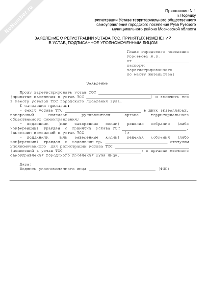 - 2226Заявление о регистрации устава территориального общественного самоуправления муниципального образования «Городское поселение Руза» Московской области, принятых изменений в устав, подписанное уполномоченным лицом