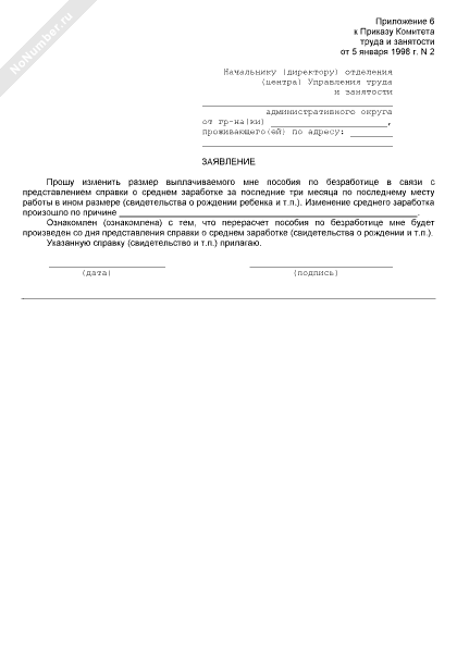 - 2376Заявление об изменении размера выплачиваемого пособия по безработице в связи с представлением справки о среднем заработке за последние три месяца по последнему месту работы в ином размере (свидетельства о рождении ребенка и т.п.)