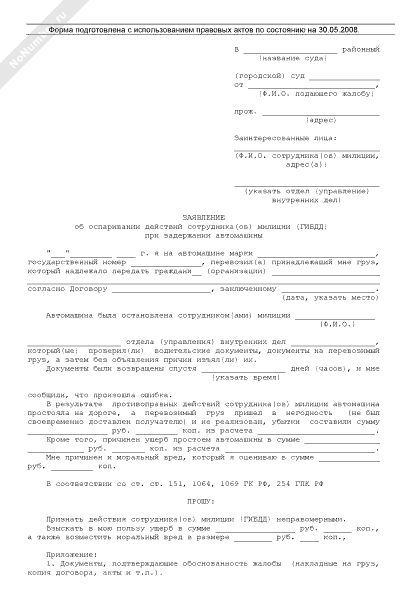 - 2477Заявление об оспаривании действий сотрудника(ов) милиции (ГИБДД) при задержании автомашины