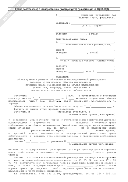 - 2475Заявление об оспаривании решения об отказе в государственной регистрации договора купли-продажи объекта недвижимости, перехода права собственности на объект недвижимости (жилой дом, квартиру, жилое помещение) и выдаче свидетельства о праве собственности