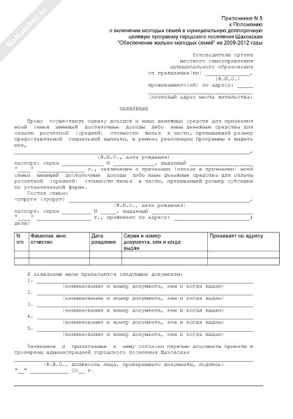 - 2480Заявление об осуществлении оценки доходов для признания семьи имеющей достаточные доходы либо иные денежные средства для оплаты расчетной (средней) стоимости жилья в части, превышающей размер предоставляемой социальной выплаты, в рамках реализации Программы «Обеспечение жильем молодых семей» на 2009-2012 годы городского поселения Шаховская Московской области