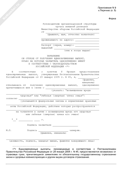 - 2512Заявление об отказе от получения единовременных выплат, право на которые заявитель одновременно имеет в соответствии с законодательством Российской Федерации (члены семей кадровых сотрудников разведки)