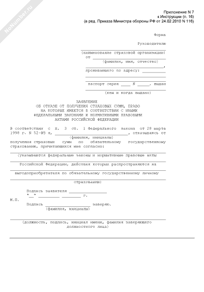 - 2510Заявление об отказе застрахованного (выгодоприобретателя) от получения страховых сумм по обязательному государственному страхованию жизни и здоровья военнослужащих федеральных органов государственной охраны и граждан, призванных на военные сборы, право на которые заявитель имеет в соответствии с иными Федеральными законами и нормативными правовыми актами Российской Федерации