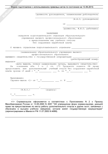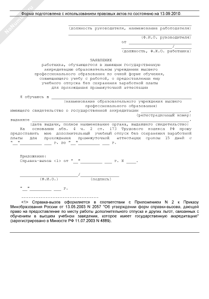 - 2836Заявление работника, обучающегося в имеющем государственную аккредитацию образовательном учреждении высшего профессионального образования по очной форме обучения, совмещающего учебу с работой, о предоставлении ему учебного отпуска без сохранения заработной платы для прохождения промежуточной аттестации