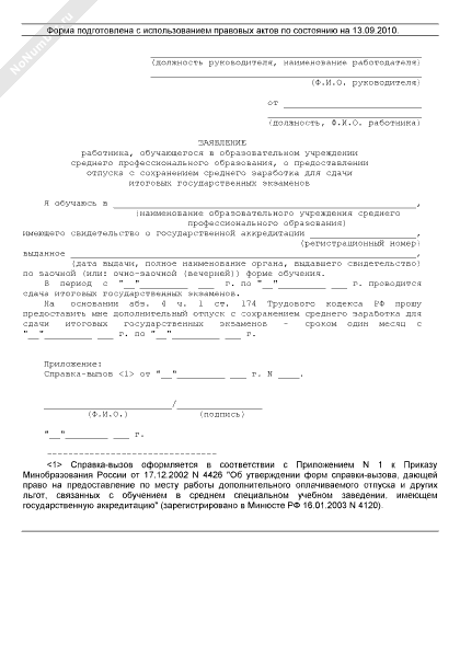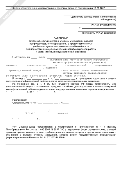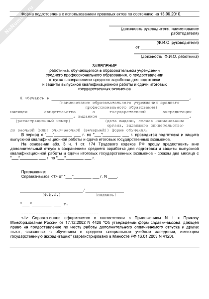 - 2830Заявление работника, обучающегося в образовательном учреждении среднего профессионального образования, о предоставлении отпуска с сохранением среднего заработка для подготовки и защиты выпускной квалификационной работы и сдачи итоговых государственных экзаменов