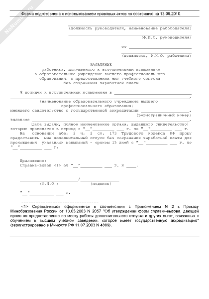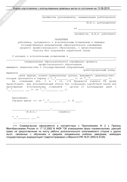 - 2839Заявление работника, допущенного к вступительным испытаниям в имеющее государственную аккредитацию образовательное учреждение среднего профессионального образования, о предоставлении отпуска без сохранения заработной платы