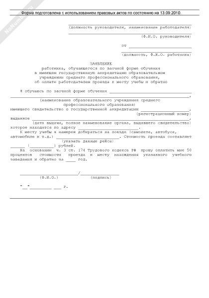 - 2840Заявление работника, обучающегося по заочной форме обучения в имеющем государственную аккредитацию образовательном учреждении среднего профессионального образования, об оплате работодателем проезда к месту учебы и обратно