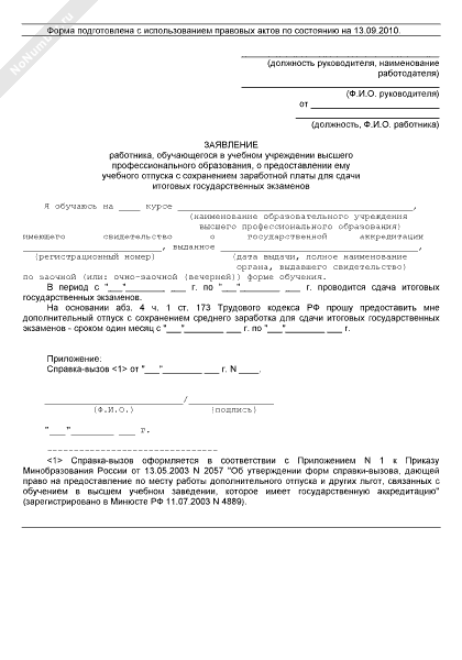 - 2828Заявление работника, обучающегося в учебном учреждении высшего профессионального образования, о предоставлении ему учебного отпуска с сохранением заработной платы для сдачи итоговых государственных экзаменов