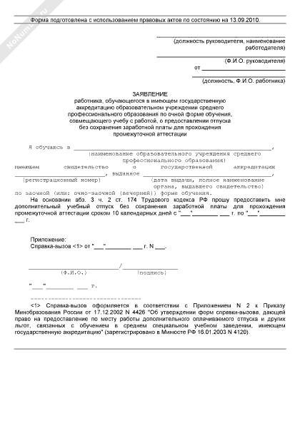 - 2831Заявление работника, обучающегося в имеющем государственную аккредитацию образовательном учреждении среднего профессионального образования по очной форме обучения, совмещающего учебу с работой, о предоставлении отпуска без сохранения заработной платы для прохождения промежуточной аттестации