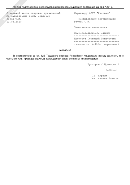 - 2825Заявление работника о замене части отпуска денежной компенсацией