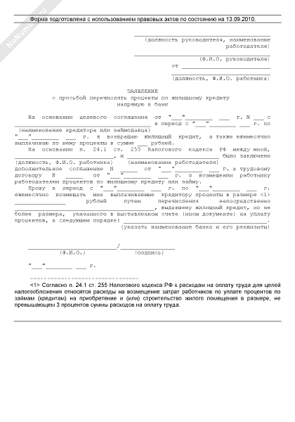- 2833Заявление работника работодателю с просьбой перечислять проценты по жилищному кредиту напрямую в банк (приложение к дополнительному соглашению к трудовому договору о возмещении работнику работодателем процентов по жилищному кредиту или займу)