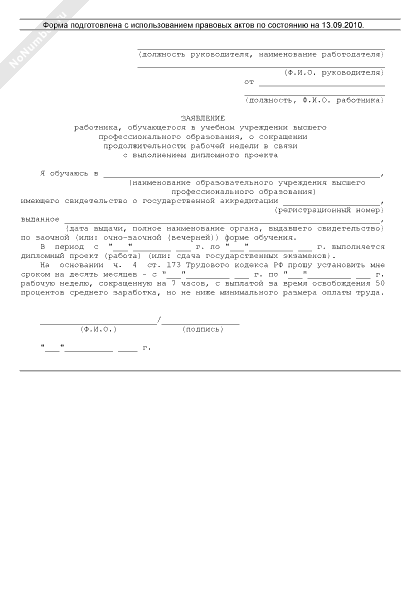 - 2842Заявление работника, обучающегося в учебном учреждении высшего профессионального образования, о сокращении продолжительности рабочей недели в связи с выполнением дипломного проекта
