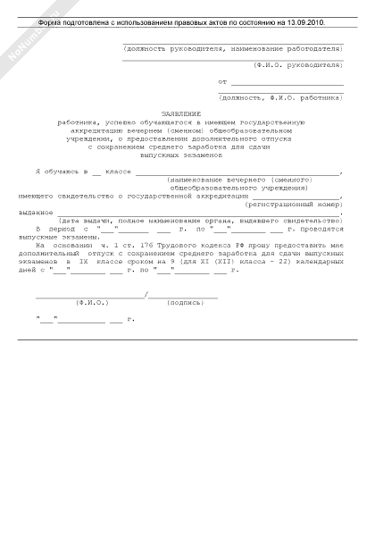 - 2844Заявление работника, успешно обучающегося в имеющем государственную аккредитацию вечернем (сменном) общеобразовательном учреждении, о предоставлении дополнительного отпуска с сохранением среднего заработка для сдачи выпускных экзаменов